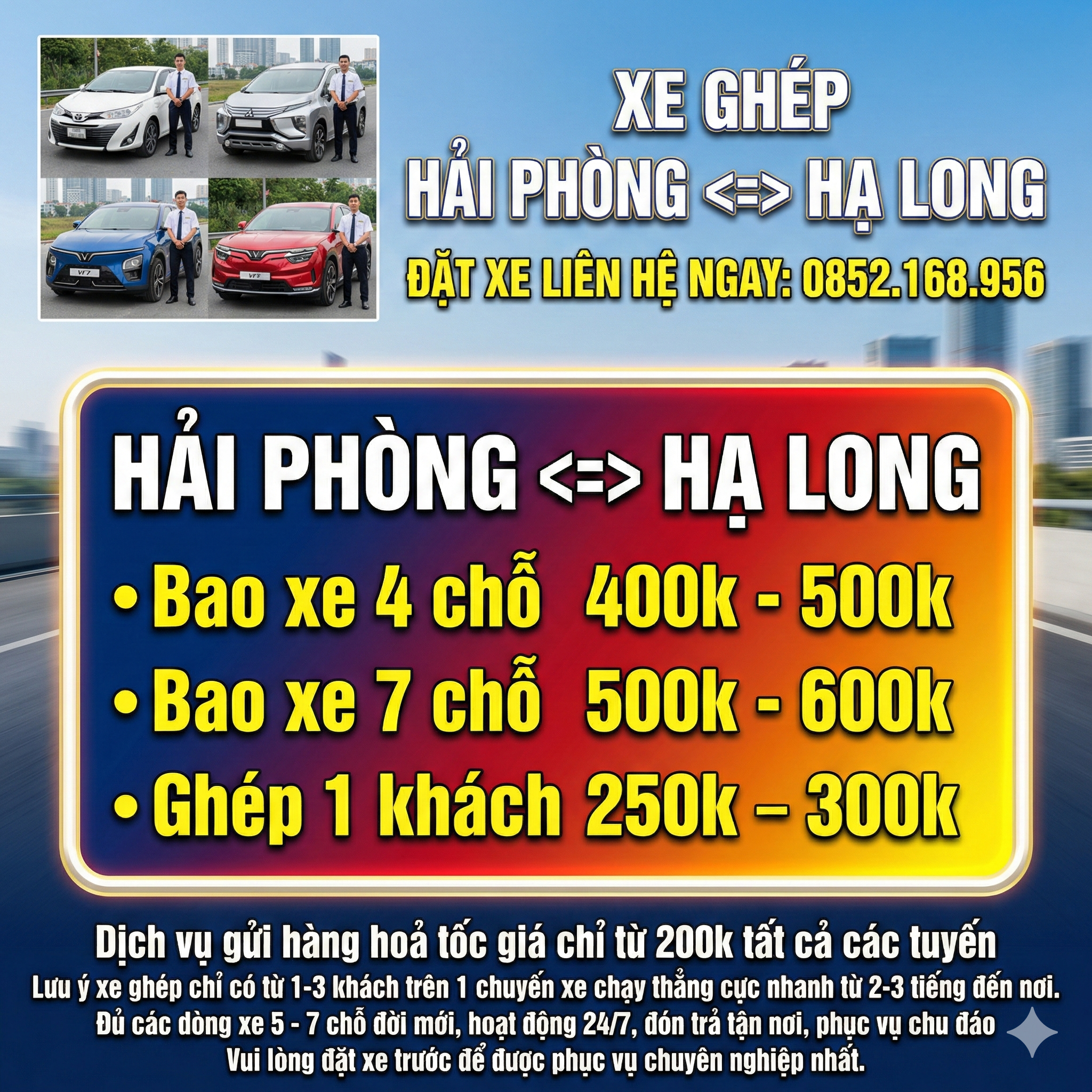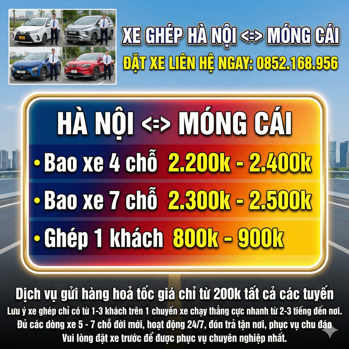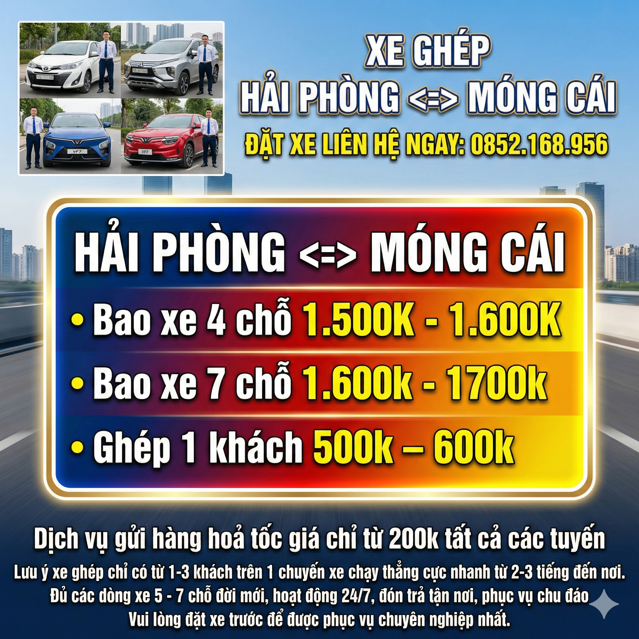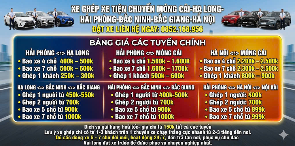 Xe Ghép MÓNG CÁI – HẠ LONG – HẢI PHÒNG – HÀ NỘI – NỘI BÀI – BẮC NINH – BẮC GIANG xin trân trọng gửi tới Quý khách hàng lời chúc sức khỏe và thành đạt trong cuộc sống để được dịch vụ taxi tốt quý khách vui lòng liên hệ: 0852.168.956 MÓNG CÁI – HẠ LONG – HẢI PHÒNG – HÀ NỘI – NỘI BÀI – BẮC NINH – BẮC GIANG cung cấp dịch vụ xe ghép Hải Phòng – Hà Nội, xe đi các tỉnh, phục vụ 24/7, dịch vụ xe taxi sân bay, taxi đường dài trọn gói giá rẻ.